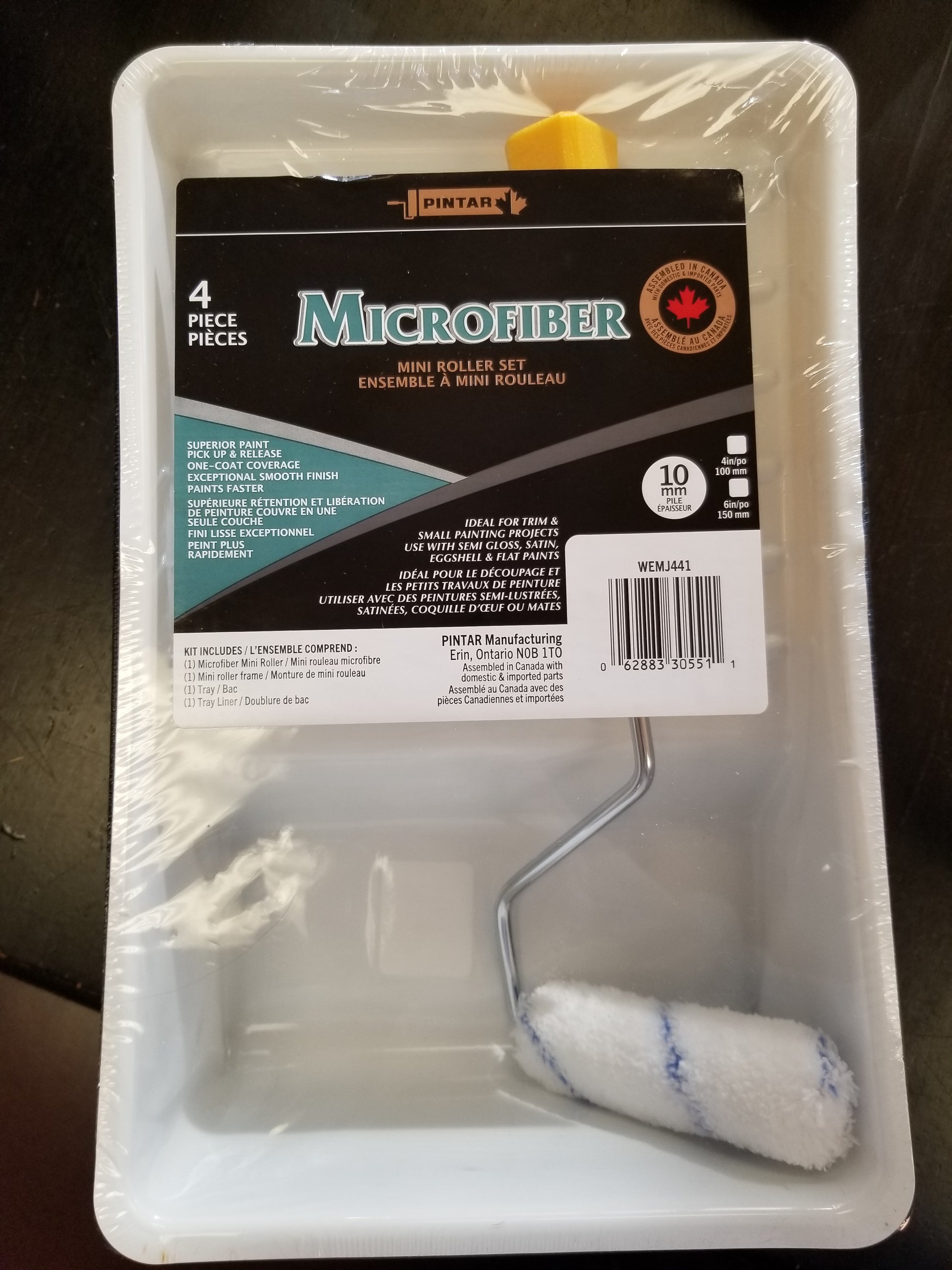 Kit includes: 1 microfiber mini roller (10mm pile, 4" length), 1 mini roller frame, 1 tray, 1 tray liner. Ideal for trim and small painting projects. Use with semi-gloss, satin, eggshell, and flat paints.