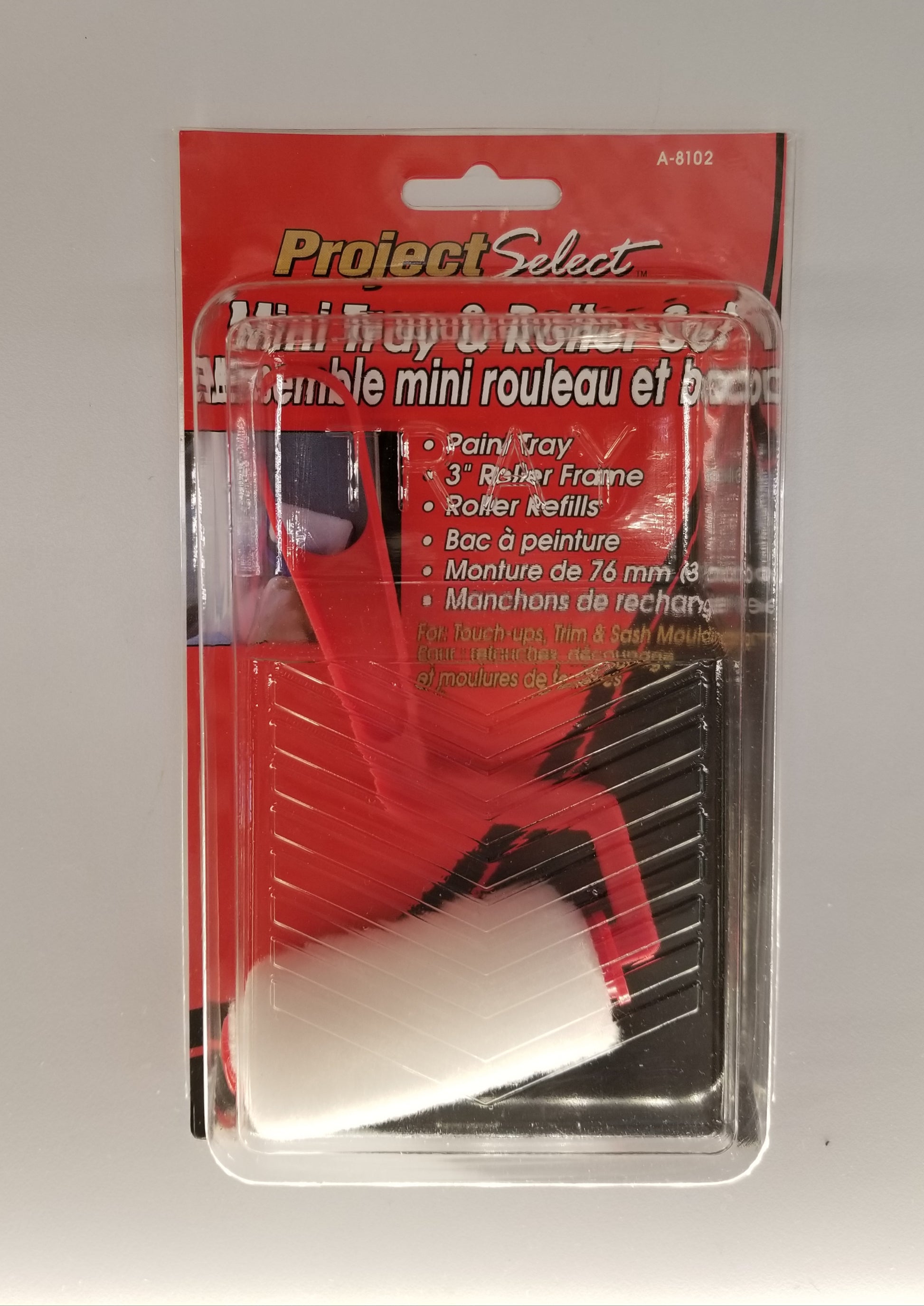 Kit Contains: paint tray, 3" roller frame, roller refill. Works with paint, varnish, and stain. Ideal for testing colours and doing small touch-ups.